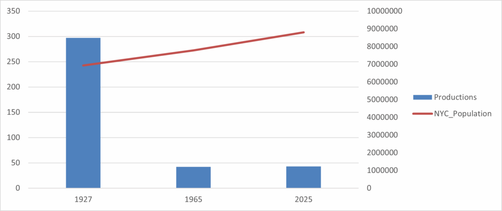 However, the evolution of entertainment mediums quickly cast a shadow over live theatre. The mesmerizing allure of the silver screen and the narratives beamed directly into living rooms via television captivated the masses. In the 1920s, cinema became a weekly habit for nearly every American, drawing audiences in numbers live theatre could never match. By 1960, television had halved movie attendance as screens entered nearly every household. New York City tells the same story in miniature. In 1926–27, nearly 300 productions opened in a single season. By the mid-1960s, that number was down to about 40 — and half a century later, it still hovers there. Adjusted for New York’s population, that’s a collapse from about 43 productions per million residents to less than 5. Even the so-called theatre capital has shrunk to a fraction of its former presence. At each step, the cultural center of gravity shifts further away from the stage, leaving theatre an ever smaller presence in the nation’s shared life.