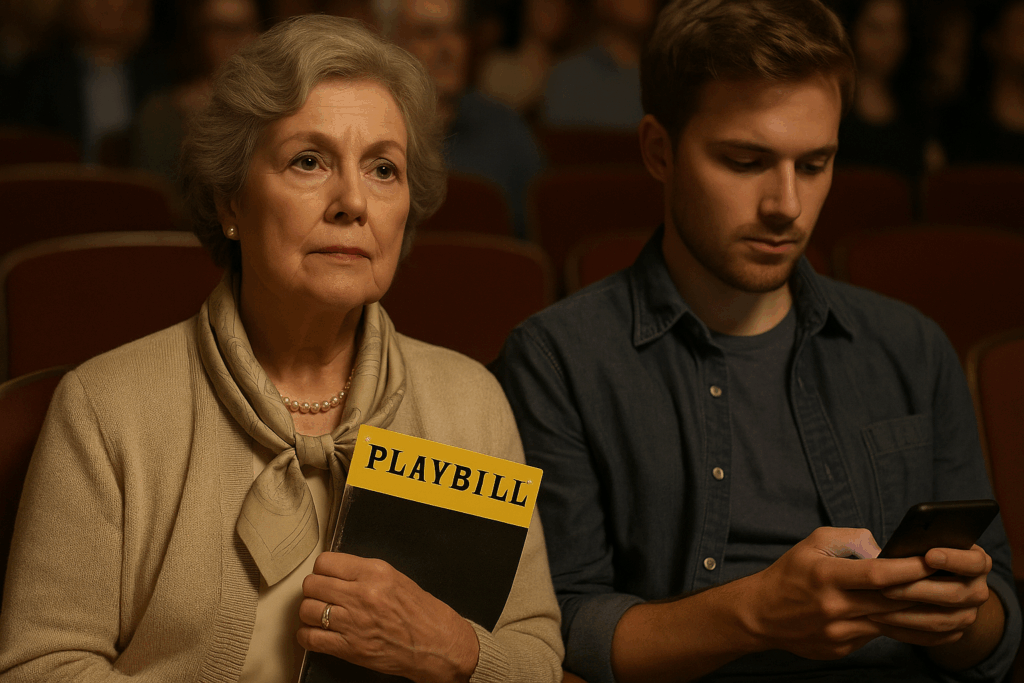 Amidst these changes, the audience attending regular community and regional theatre has significantly dwindled. And not in proportion of the population, but in real numbers. Those who still venture out to these shows are primarily limited to friends and relatives of the actors, and a handful of individuals who genuinely appreciate the immersive experience of live performances. However, this latter group, as we must politely acknowledge, is gradually diminishing. The core supporters of live theatre, once a diverse and enthusiastic community, are aging out. You and I have seen the same thing: the average live theatre audience is over 50, white, female, upper-middle class, and already loves “the arts”. Picture your Aunt Carol in a tasteful scarf, clutching a Playbill like it’s the Magna Carta. The numbers bear it out. In 2002, 12% of U.S. adults went to a non-musical play. By 2022, barely 4.5% did. Even musicals fell from 17% to 10%. Within a single generation, half the audience vanished.